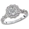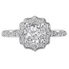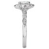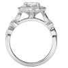 This Elegant Ring Features a Scalloped Halo of Sparkling Round Diamonds set in High Polished 18k White Gold with a Fancy Shank. (D 1/5 carat total weight) This ring is a SEMI-MOUNT and it comes with NO CENTER STONE as shown but it will accommodate a 6.5mm round center stone.